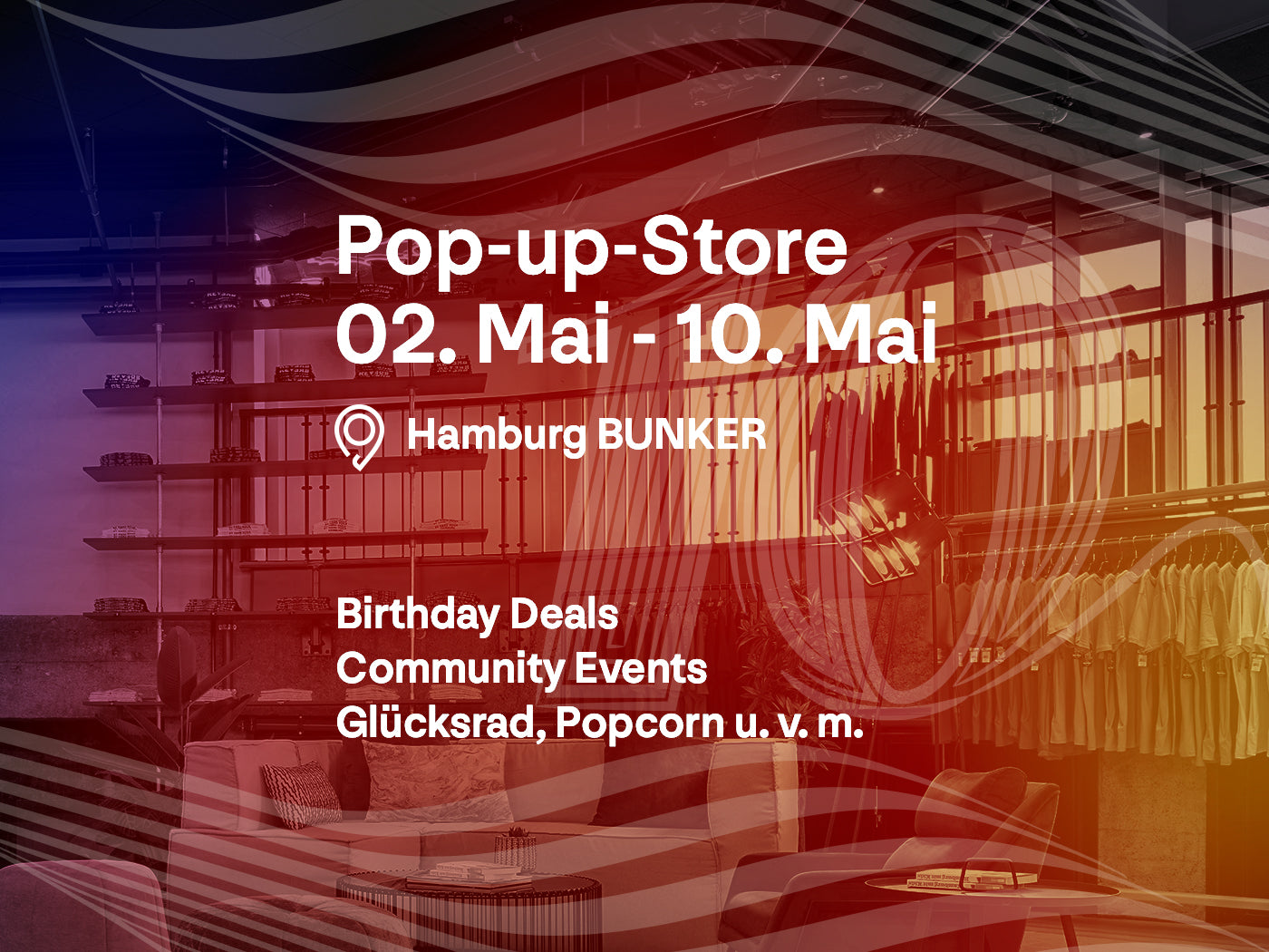 Vom 02.-10. Mai übernehmen wir den Store auf dem BUNKER Hamburg auf St. Pauli. Das ist deine Gelegenheit, unsere Styles vor Ort zu testen und dir tolle Deals und Gewinne am Glücksrad zu sichern!