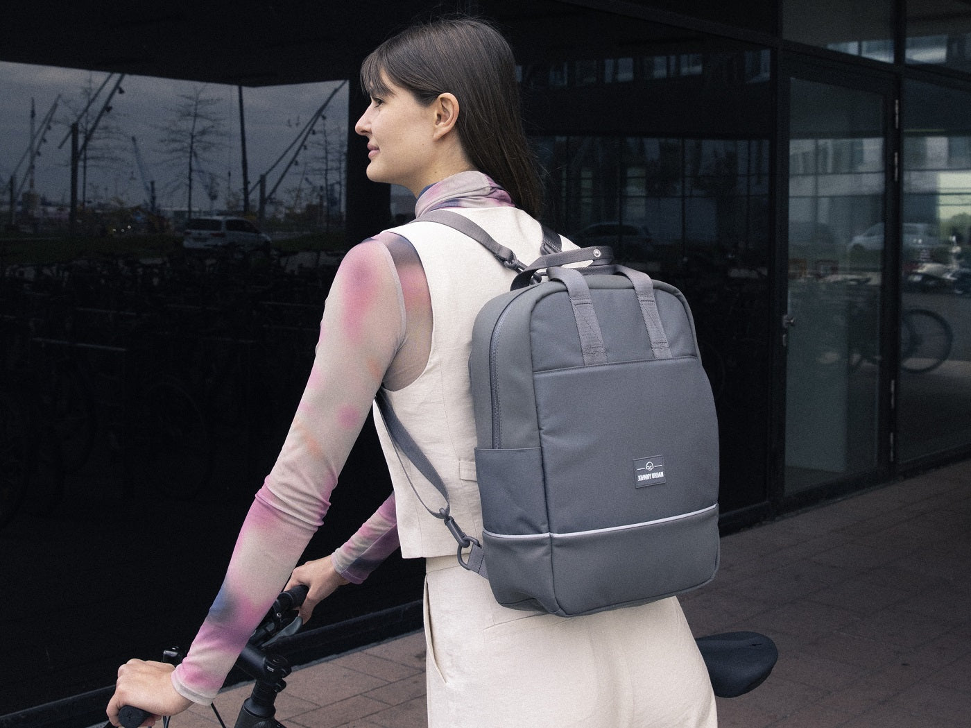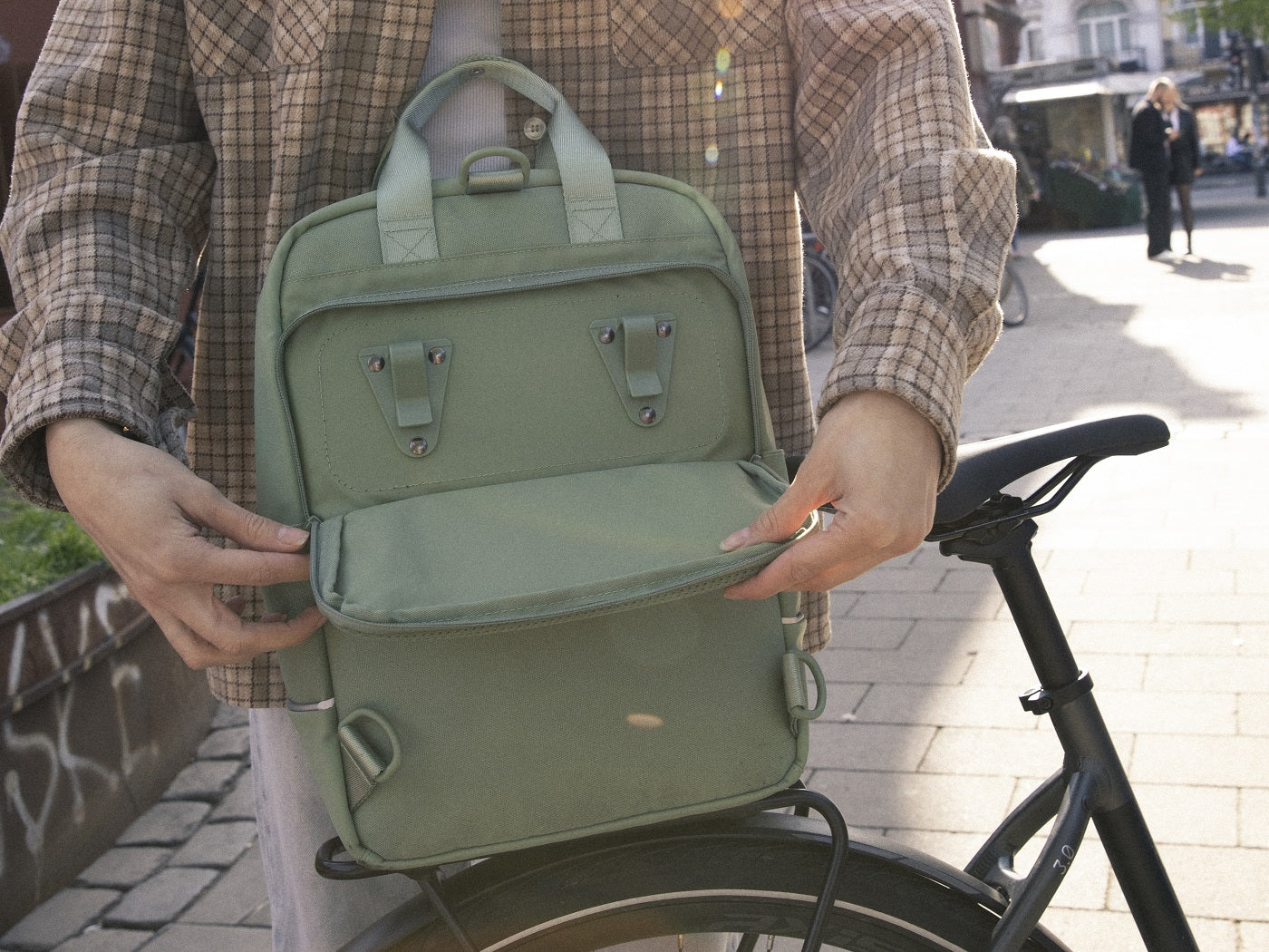 Für deinen Alltag mit und ohne Fahrrad: Unser Tagesrucksack "Jona" mit integrierter Gepäckträgerhalterung.
